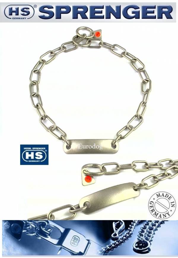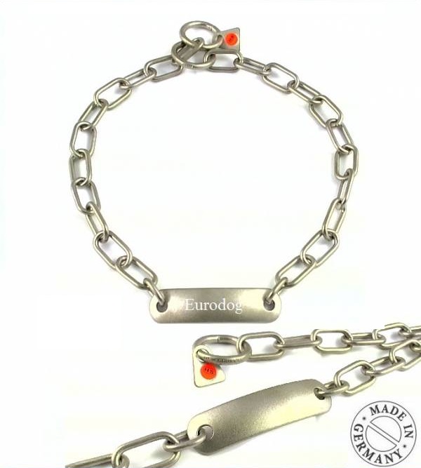 Questa collana è caratterizzata da maglie medio-lunghe, che corrono molto bene attraverso l'anello. A causa degli elevati carichi di rottura, questo modello garantisce una buona sicurezza per le razze sia piccole che grandi. Poiché lo scudo del collare non ha rivestimento aggiuntivo, è ideale per l'incisione!