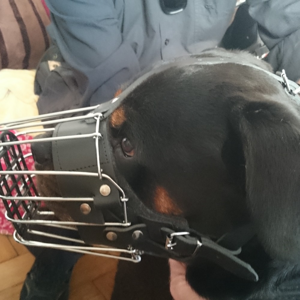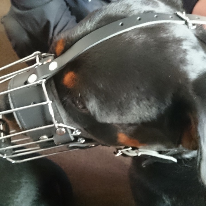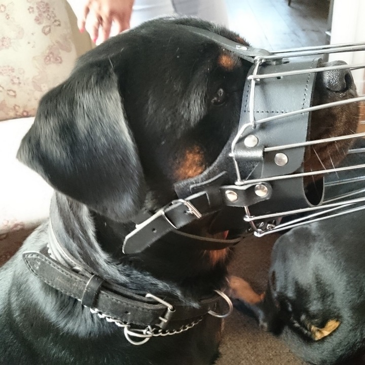 Muso appositamente preparato per cani Rottweiler a causa della costruzione della testa. Realizzato in metallo cromato fili e cinghie di cuoio fissati nella parte posteriore della testa. Le aree di contatto della museruola con il muso del cane sono imbottite di feltro. Il suo vantaggio è la durata e la facilità di manutenzione. Una museruola metallica ben aderente consente al cane di vagare e bere acqua, offrendo un grande comfort. Realizzato a mano con alta precisione per garantire comfort e sicurezza per il cane.